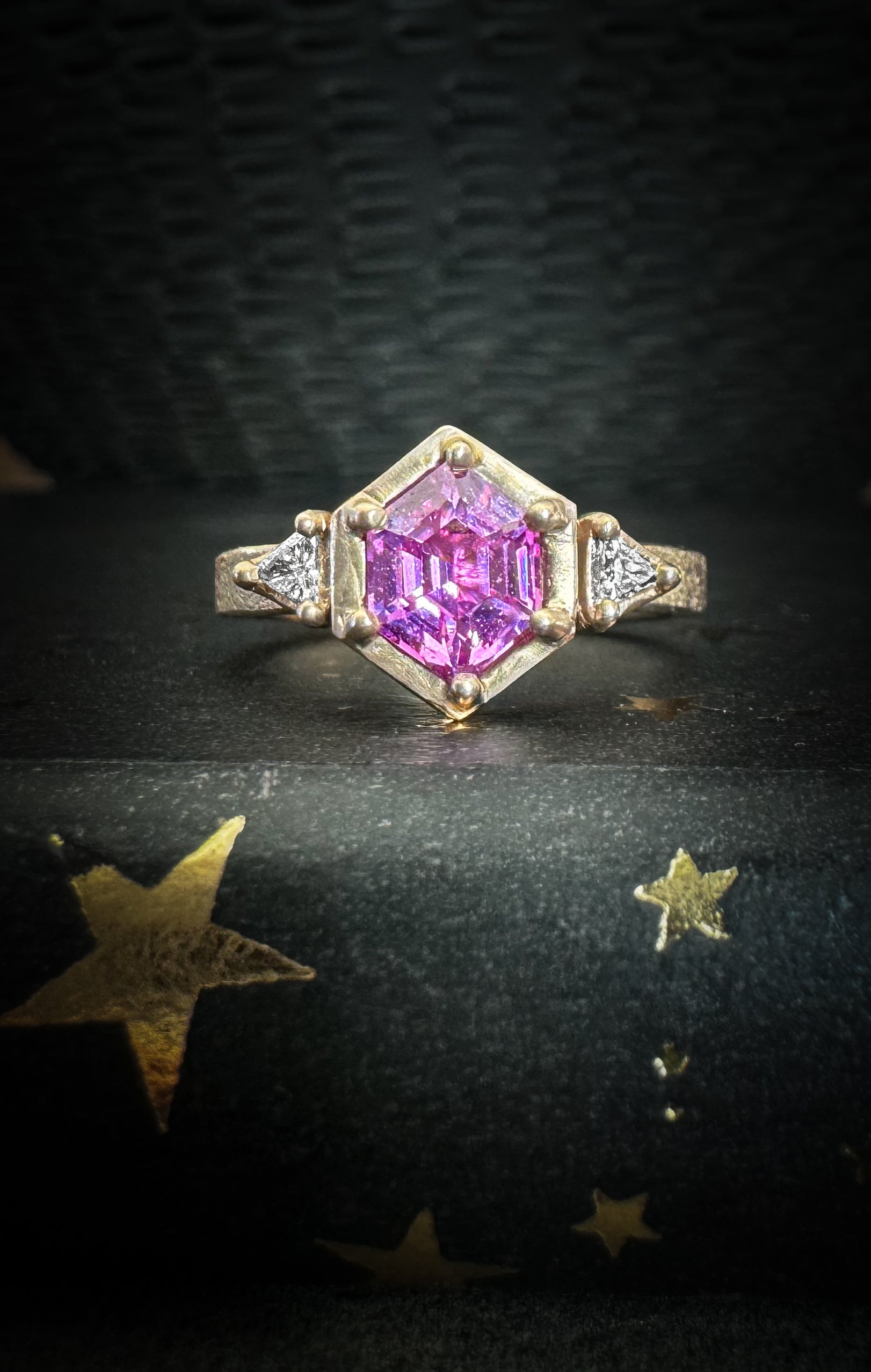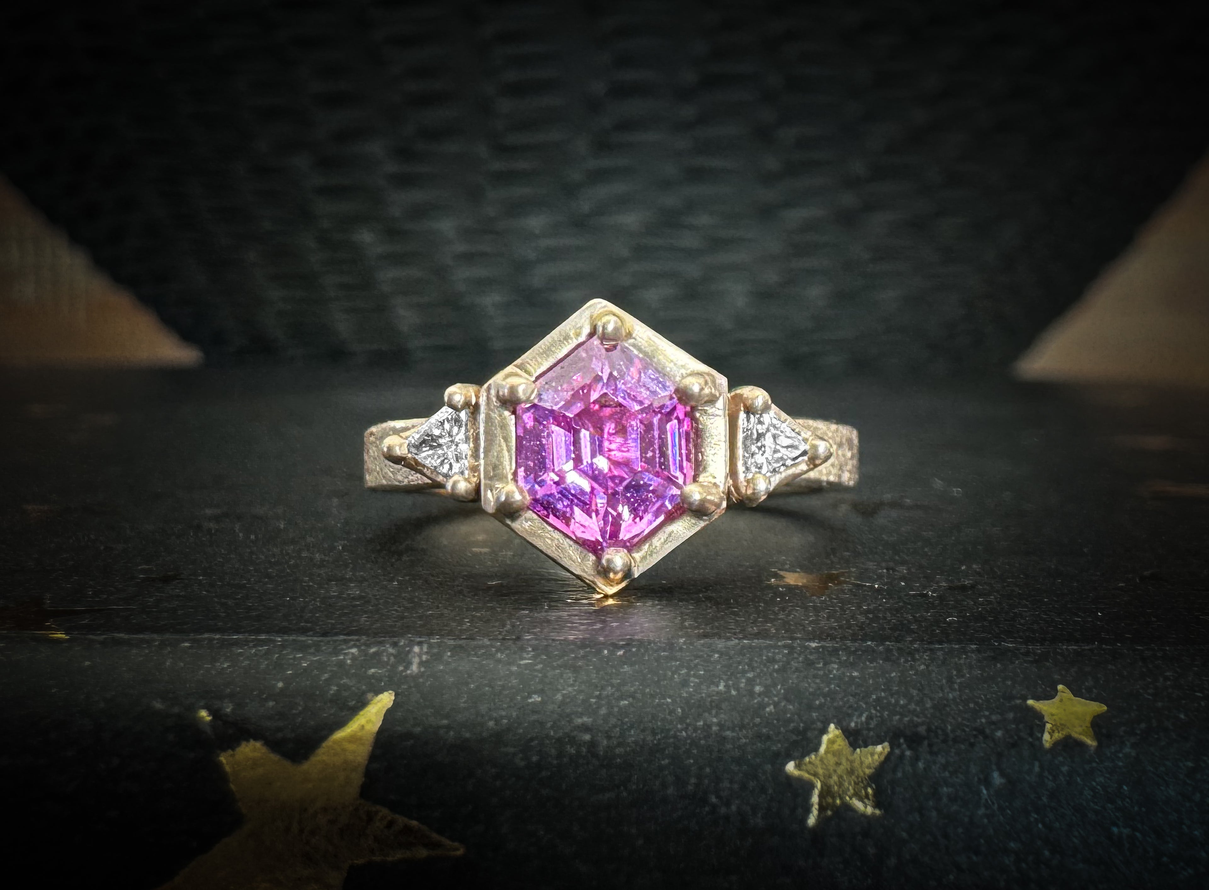 14K Champagne Gold Pink Sapphire Engagement Ring With Side Triangle Diamonds