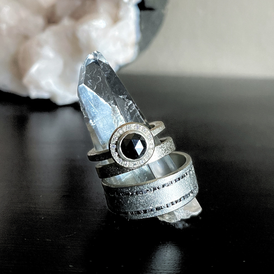 14K Gold Rustic Black Diamond Ring with Diamond Halo