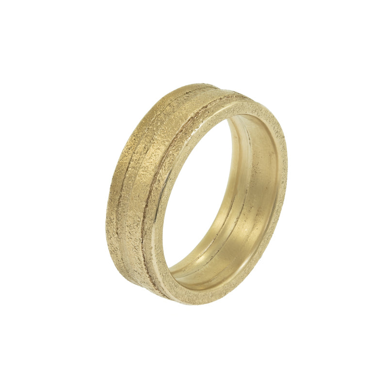 This ring is solid 14K Gold and has a unique uneven band pattern as well as our signature texturing. The inside of the ring has a smooth surface with rounded edges for a comfortable fit. This ring is offered in four colors of gold and all our gold is sourced from recycled gold suppliers.